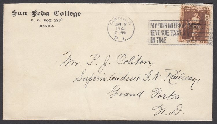 Manila. Used from Manila to North Dakota, USA. Stamp (torn on bottom right