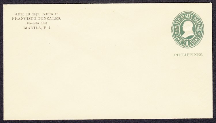 England. Stamp tied with Manila 15 Apr 1910 duplex cancel. Minor corner faults, and creasing on top right and left sides. Nice