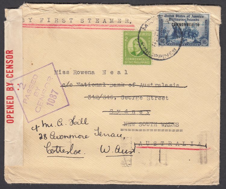 Sydney receiving CDS. Purple boxed Passed by Censor handstamp. Corner edge