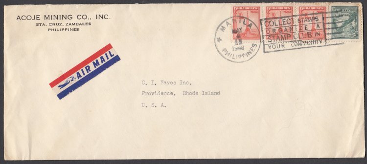 Commercial long cover from Manila to Rhode Island, USA. Stamps tied with