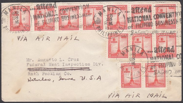 Commercial re-addressed cover from Manila to Iowa, USA. Stamps tied with
