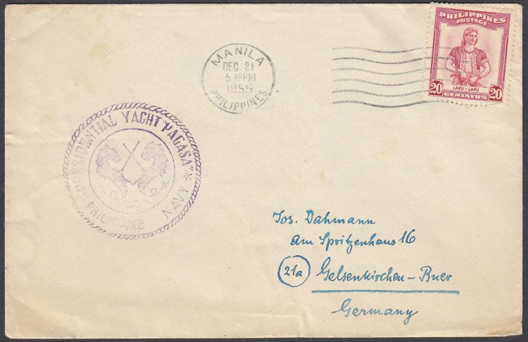 cancel. Beautiful purple circular seal (Presidential Yacht Pagasa – Philippine Navy) handstamp on front. Very minor