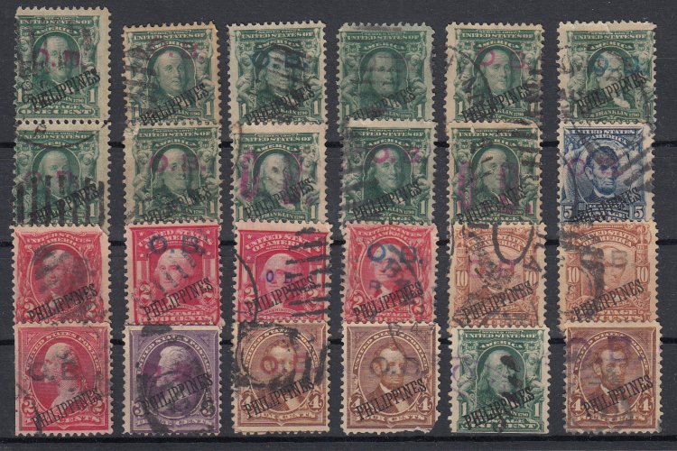 (x12), 227 (x2), 230, 233 (x2), 240 (x2) Used. Nice group of early overprinted stamps all with Handstamp O.B..