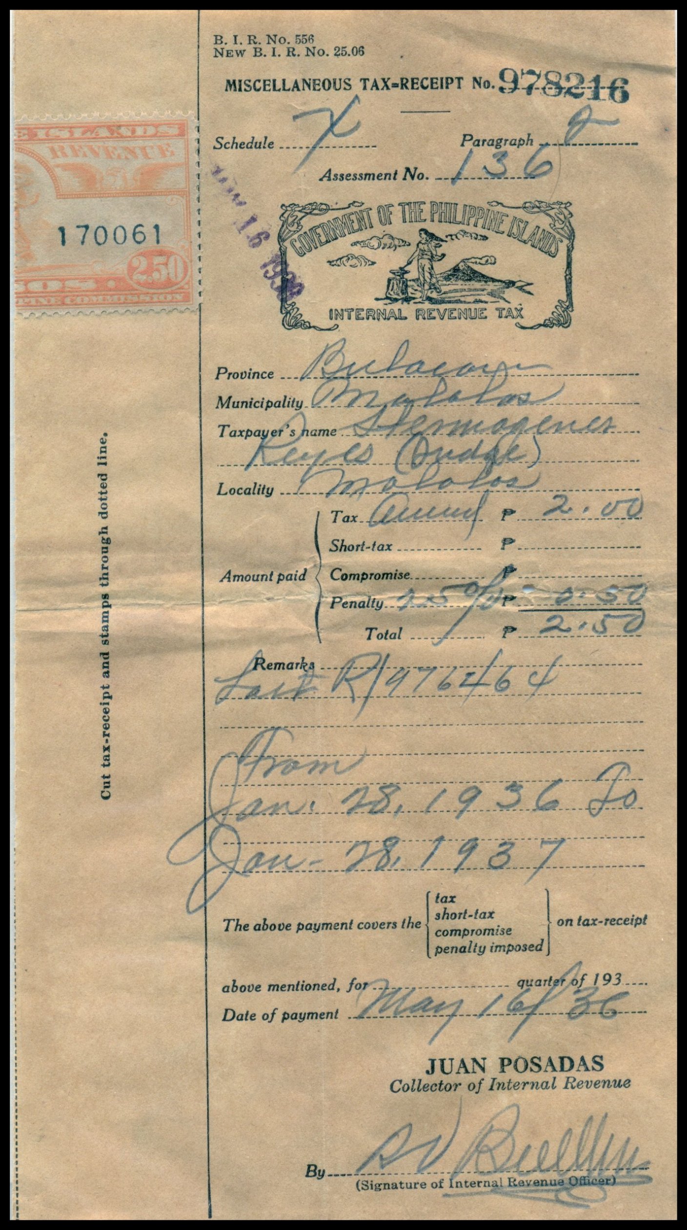 Revenue Tax Receipt dated May 16, 1936. Type B Control number. Horizontal and