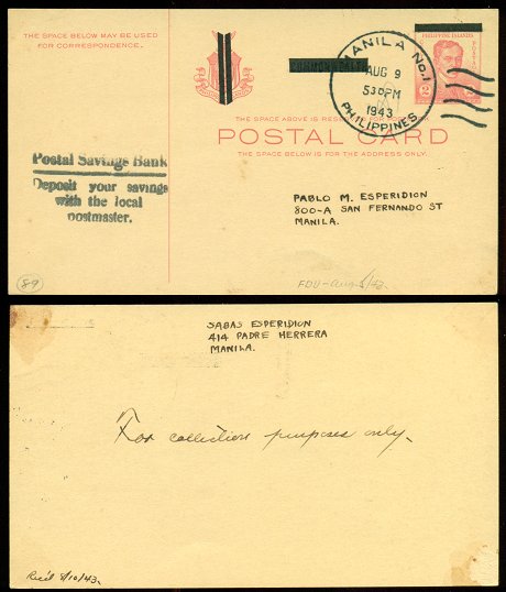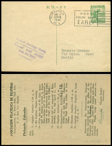 circular handstamp dated June 19, 1944. PPC Flashes (Rizalianatically) on